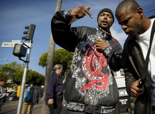 Papa Don and DJ Duck start up a flow on the street near Mission and 24th streets on Thursday afternoon in San Francisco. Papa Don and DJ Duck are independent hip-hop rappers and producers performing with the Hood Star Records label, which Papa Don owns and operates. “I cleaned my act up and got into music,” Papa Don said. “It’s like God put it in my life to keep me moving.”