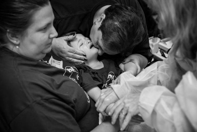 A doctor removes Arianna Failla’s IV as she cries in her mother’s arms and her grandmother attempts to comfort her at the Golisano Children’s Hospital in Syracuse, N.Y. Arianna suffers from Tuberous Sclerosis, a rare genetic disease that causes benign tumors to grow in her brain, heart, and kidneys.