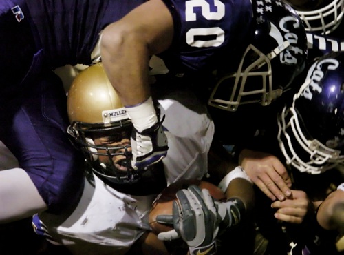 Mullen High School running back Jarrett Hullum, white, is smothered by Arvada West defenders Scott Sanchez, 20, and Christian Collins, in the first half of the 5A state semifinals in Arvada, Colo., Friday, Nov. 25, 2005. Mullen went on the win the game 58-38.