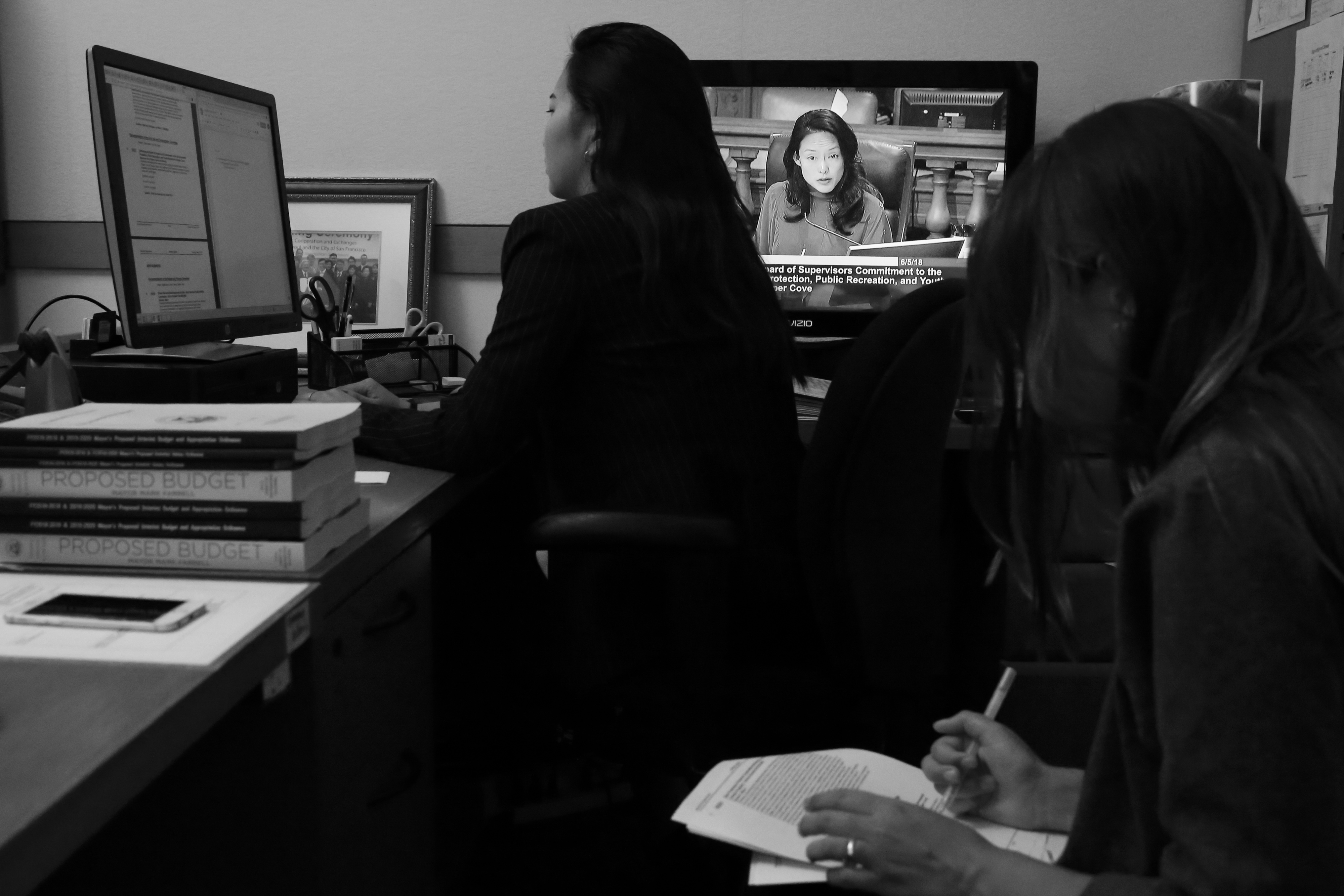 Interns Maddy Dwyer, 21, and Karina Sun, 20, take notes as Jane speaks during a Board of Supervisors meeting on Tuesday, June 5, 2018.