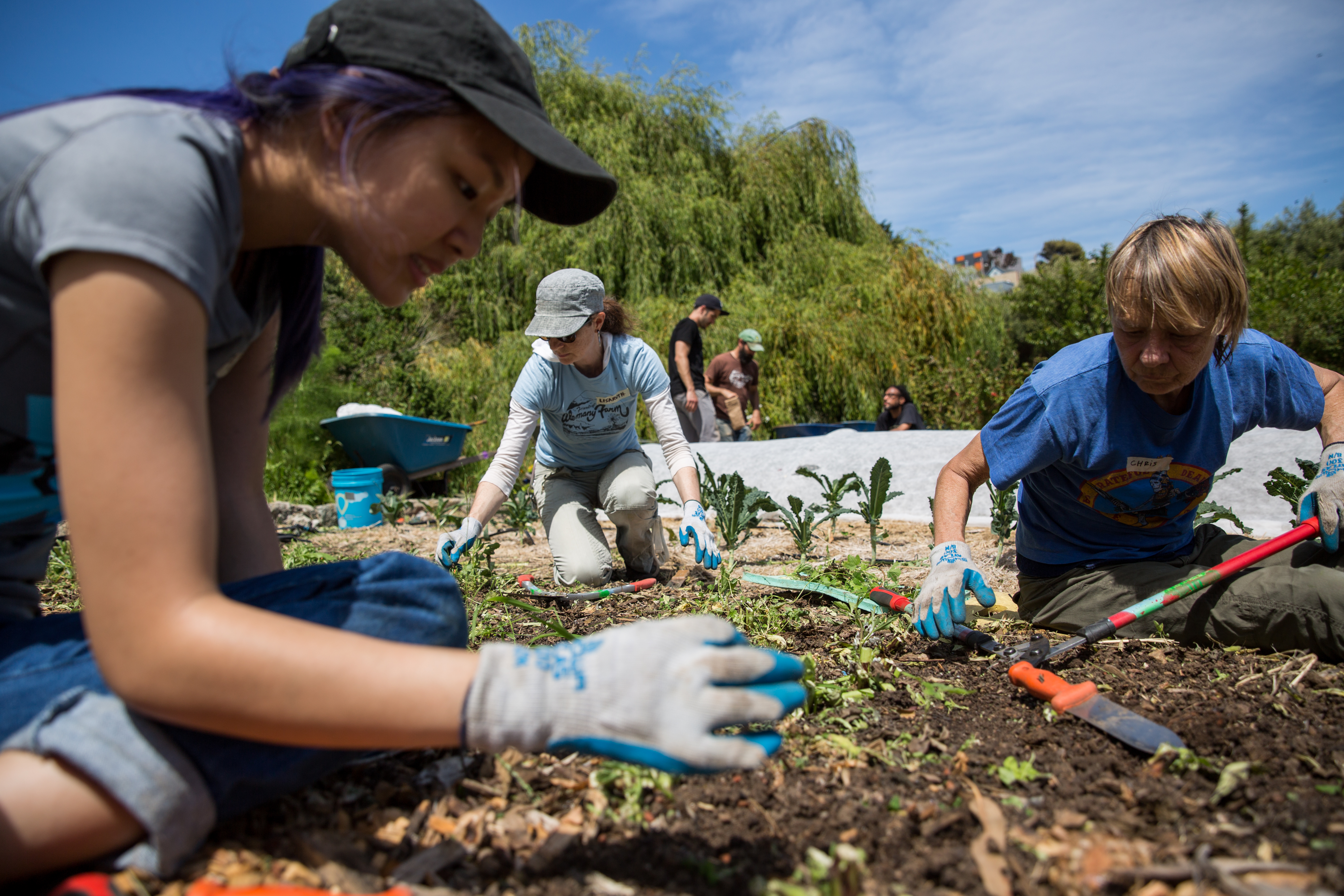 SINGLE - From left to right, Tina Liang, LisaRuth Elliott, and Chris Brazis pull weeds and fava bean stems from a bed at Alemany Farm in Bernal Heights, San Francisco. Alemany Farm is a 3.5 acre green space that not only offers a respite from the bustle of city life, but also gives community members access to free organic fruits and vegetables. LisaRuth has been volunteering at Alemany Farm since 2010 and says it's important to her because it creates a community centered around the common goal of helping to teach people to produce their own food, but she sticks around especially for the diversity of bird, insect, and plant life. "This ecosystem that's maintained is a nurturing space for me personally, too... It makes me a better person to be here, so I keep coming back because there's community that I want to be with."