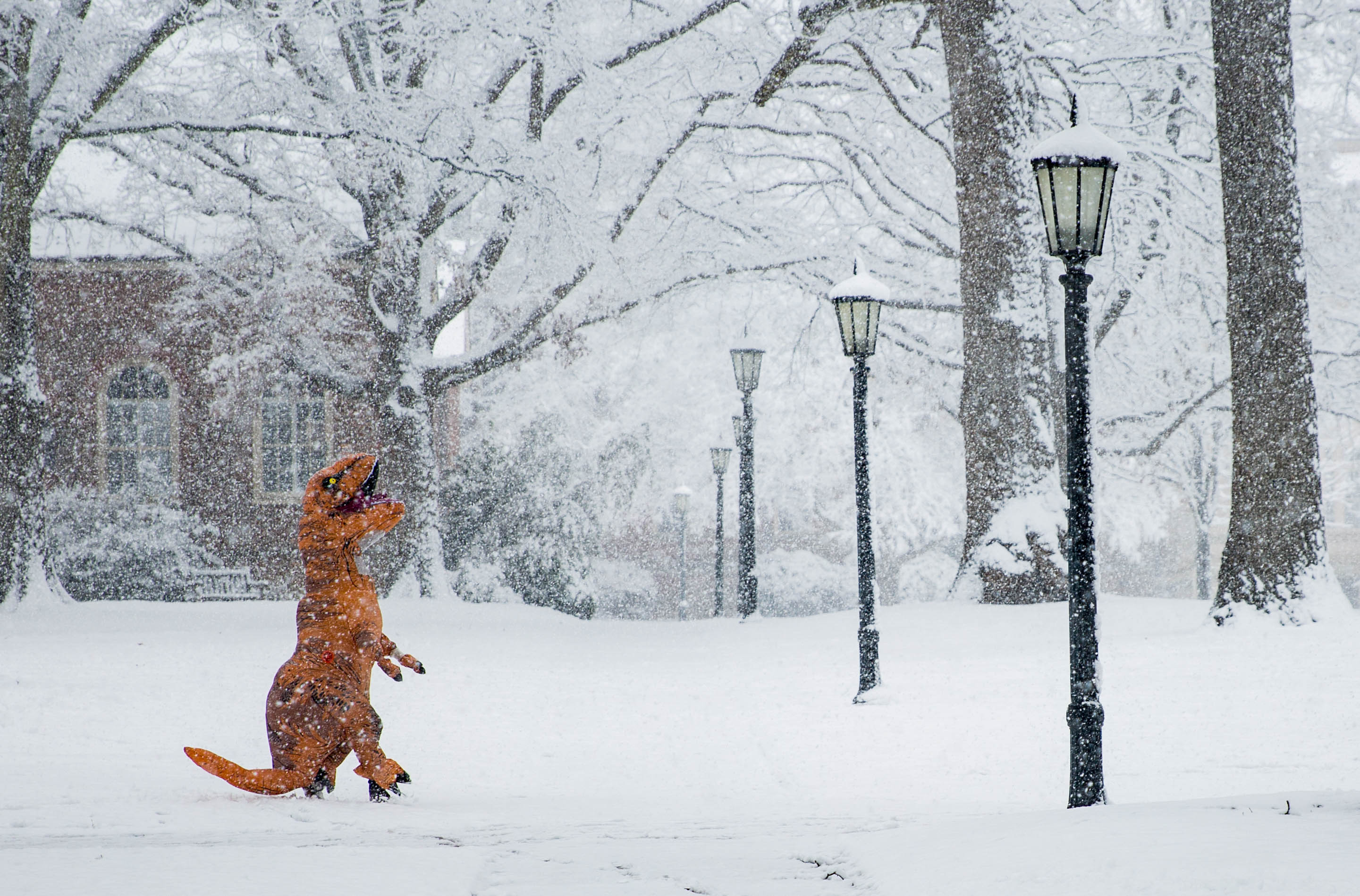 Feature 2 - A student dressed in a T-rex costume makes her way through McCorkle Place during a snow storm in Chapel Hill on January 17th.