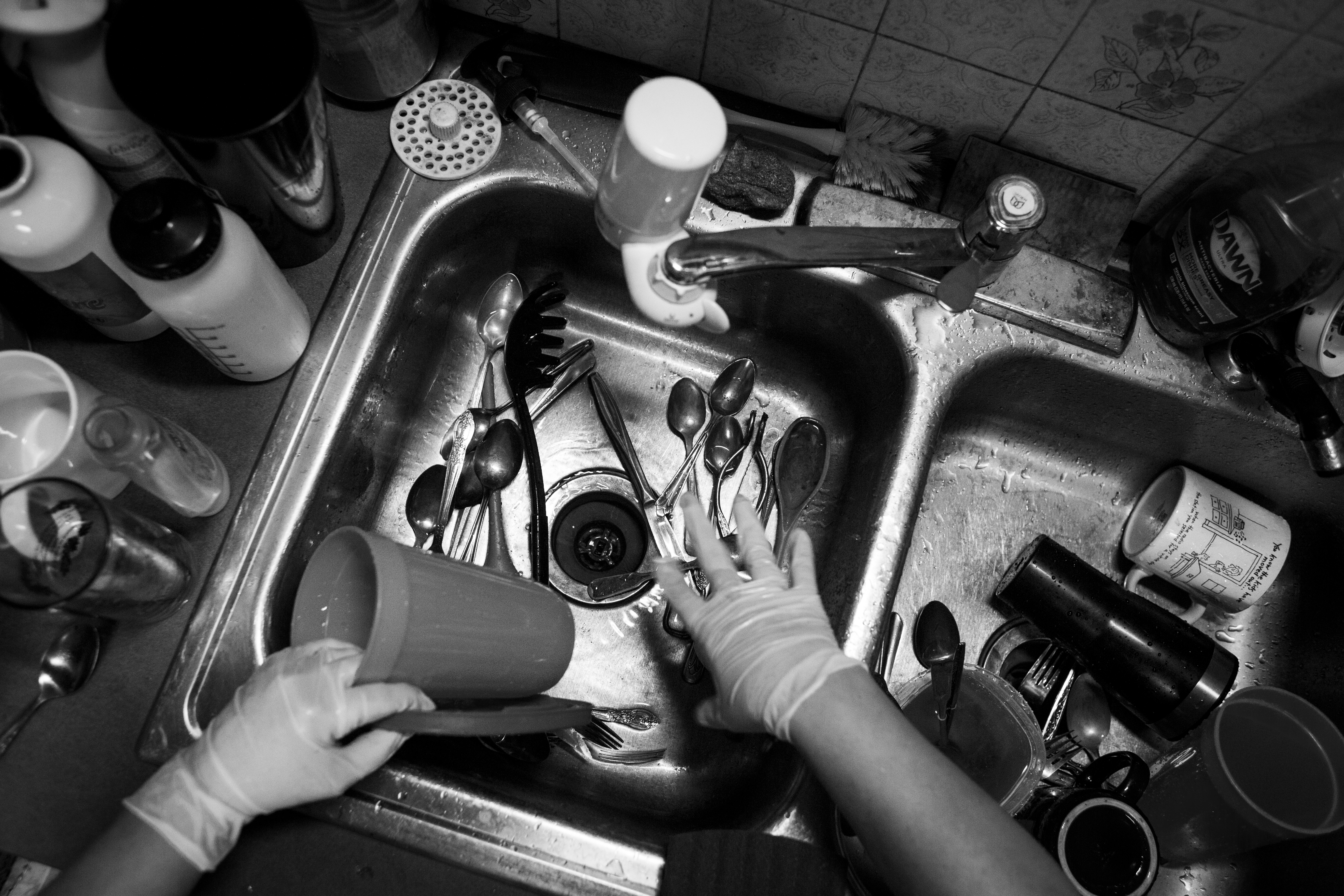 Kenth Ebberson, 35, peeks from behind a cabinet in the entryway of his room. Due to violent behavior and the demands of care for his mental handicap, Kenth's parents sent him to live in the institution at the age of 21. By mistake he was originally sent to live in home for individuals with autism, a condition he does not have. There he was greeted with a structured and strict lifestyle that heightened his violent behavior and he reverted to isolation. It was years before he was moved.
