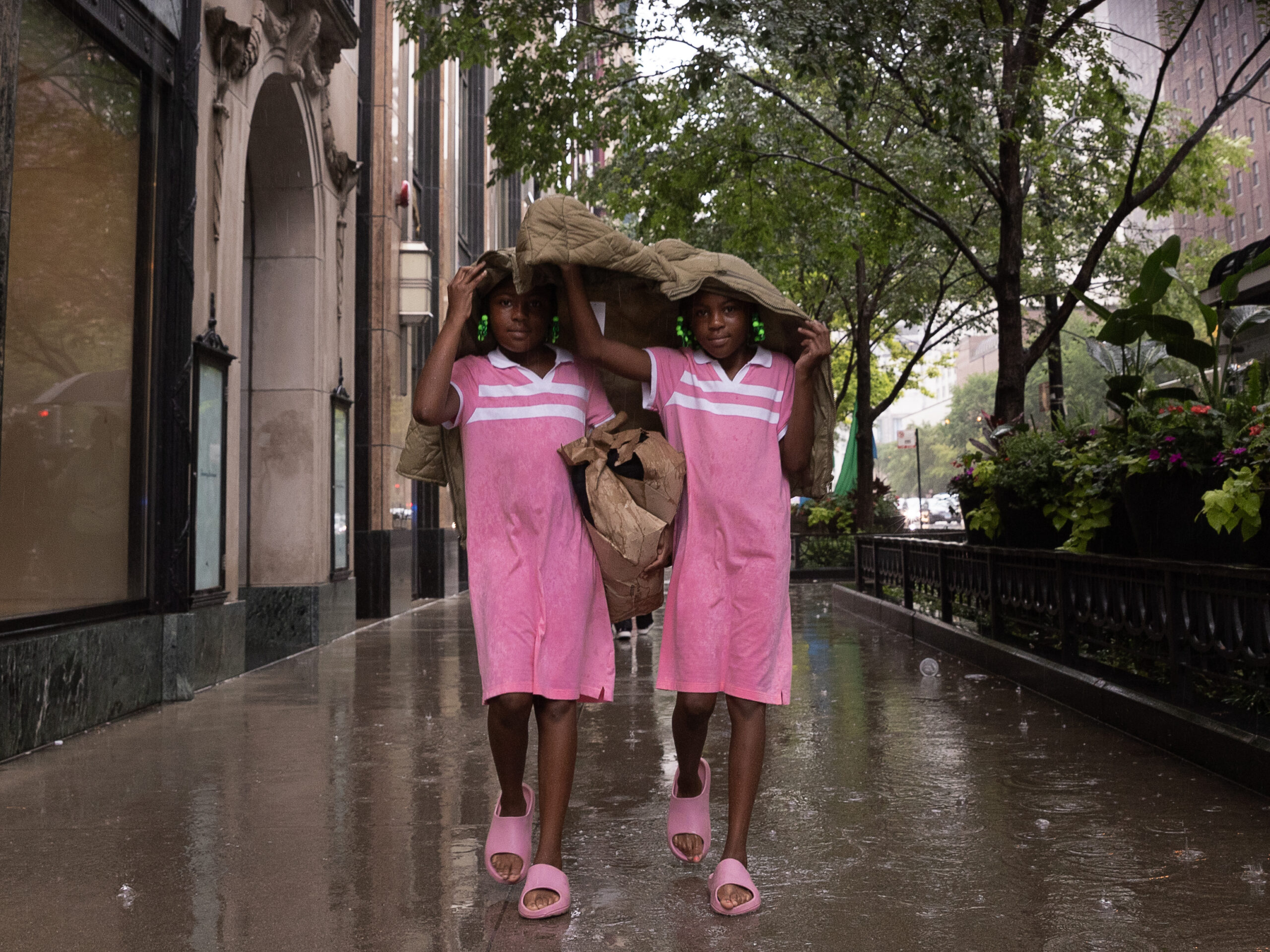 Twins Jesenia and Jasi Barry, 9, from New Jersey, protect themselves from heavy rain by holding a coat over their heads while walking south on Michigan Avenue on Wednesday, July 12, 2023 in Chicago, Ill.